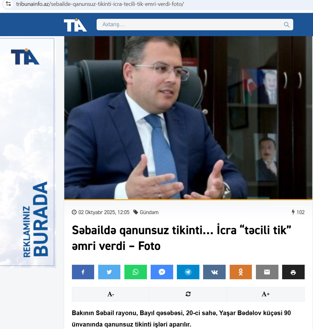 Ətrafda yaşayan sakinlərin sözlərinə görə, tikinti icra hakimiyyəti ilə razılaşdırılıb və “icradan təcili tikin” tapşırığı verilib.