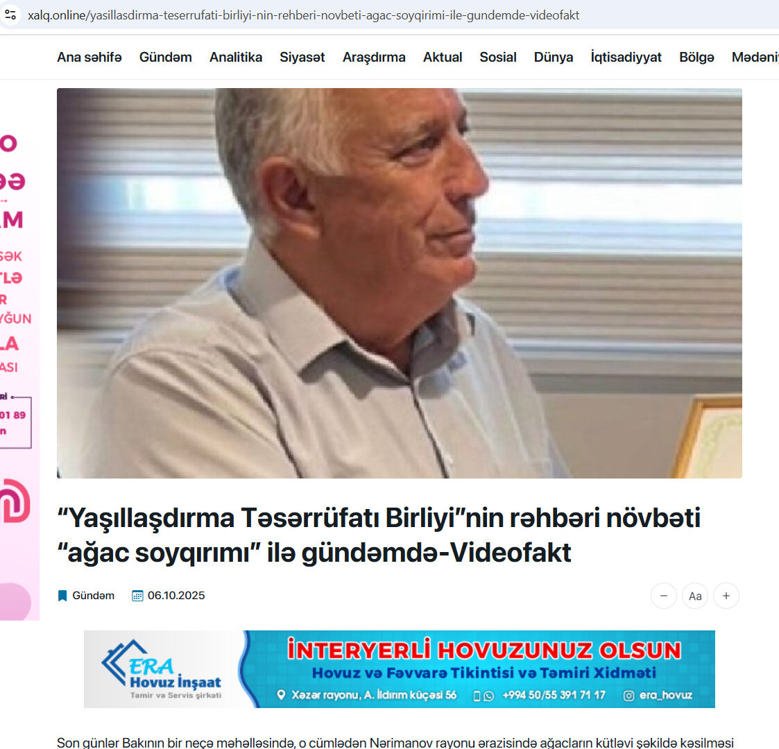 Belə ki, Nərimanov rayonu Əhməd bəy Ağaoğlu küçəsində Bakı şəhər İcra Hakimiyyətinin Yaşıllaşdırma Təsərrüfatı Birlyinin əməkdaşlarının köməyi və müşayəti ilə 20 ədəd iri gövdəli eldar şamı kəsilərək ərazidən uzaqlaşdırılıb. Məlumata görə həmin ağaclar adının açıqlanmadığı tikinti maqnatının sifarişi əsasında kəsilib və tikinti aparılması üçün ərazi yaşıllıqlardan təmizlənir.