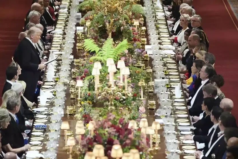 Ən diqqətçəkən məqamlardan biri isə Tramp ailəsi üçün Vindzor sarayında qurulan, uzunluğu 47 metrdən çox olan dəbdəbəli şam yeməyi masası olub.