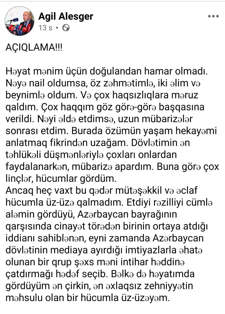 Yeni Çağ Media Group-nun rəhbəri Aqil Ələsgər facebook sosial şəbəkəsində bir qrup şəxs tərəfindən hədəfə alındığını qeyd edib. 1xeber.media jurnalist Aqil Ələsgərin yazdığı statusu olduğu kimi təqdim edir: