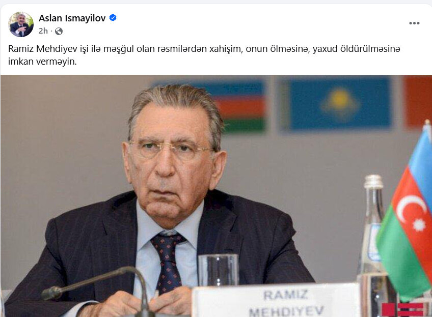 "Ramiz Mehdiyev işi ilə məşğul olan rəsmilərdən xahişim, onun ölməsinə, yaxud öldürülməsinə imkan verməyin".