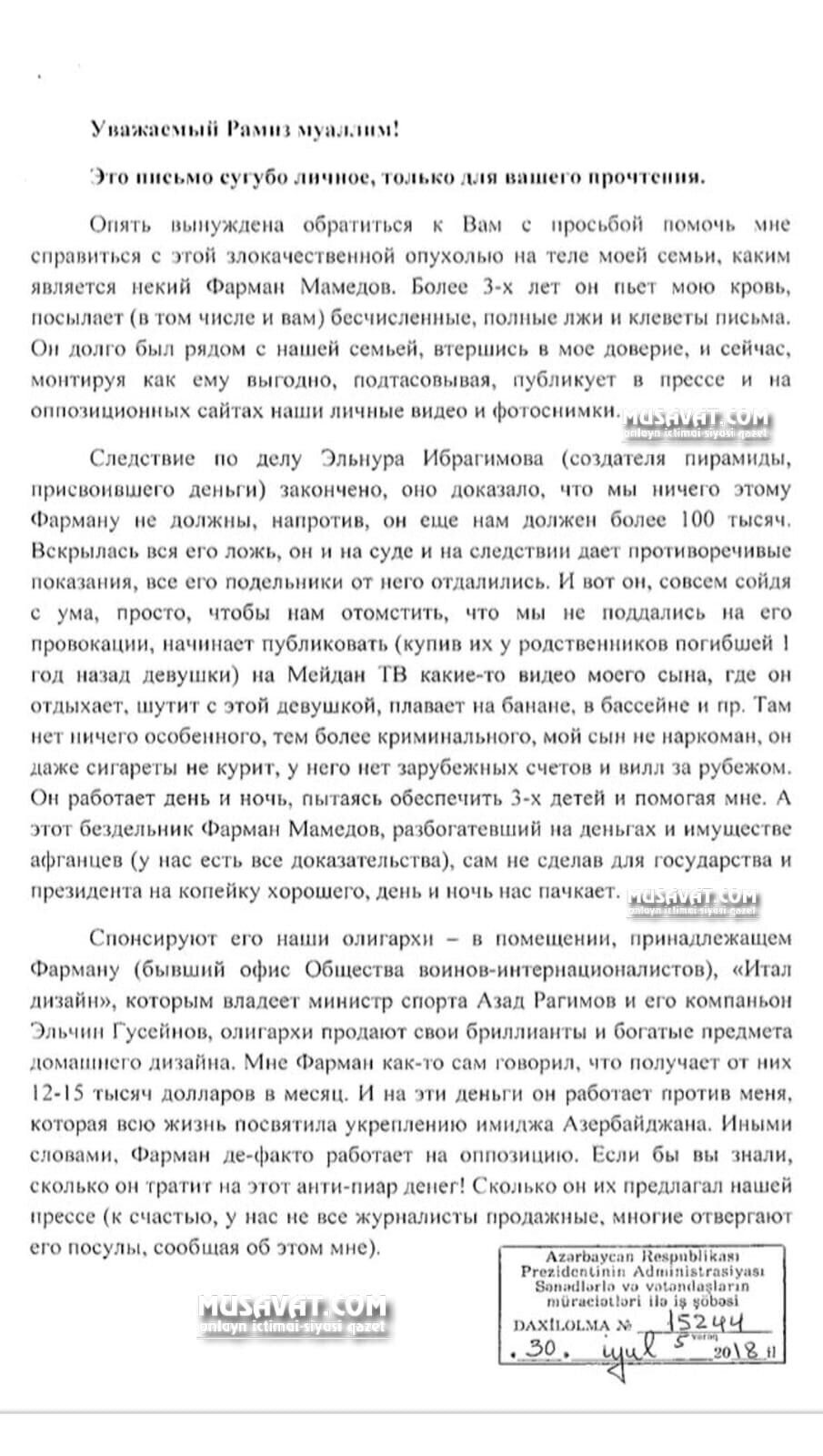 O məktub 2018-ci ilin payızında yazılmış, Ramiz Mehdiyevə sədaqət andı kimi təqdim olunan, amma əslində, bir çoxlarını hədəfə alan donos ruhlu yazı Elmira Axundovanın kimliyini çoxdan açıb.