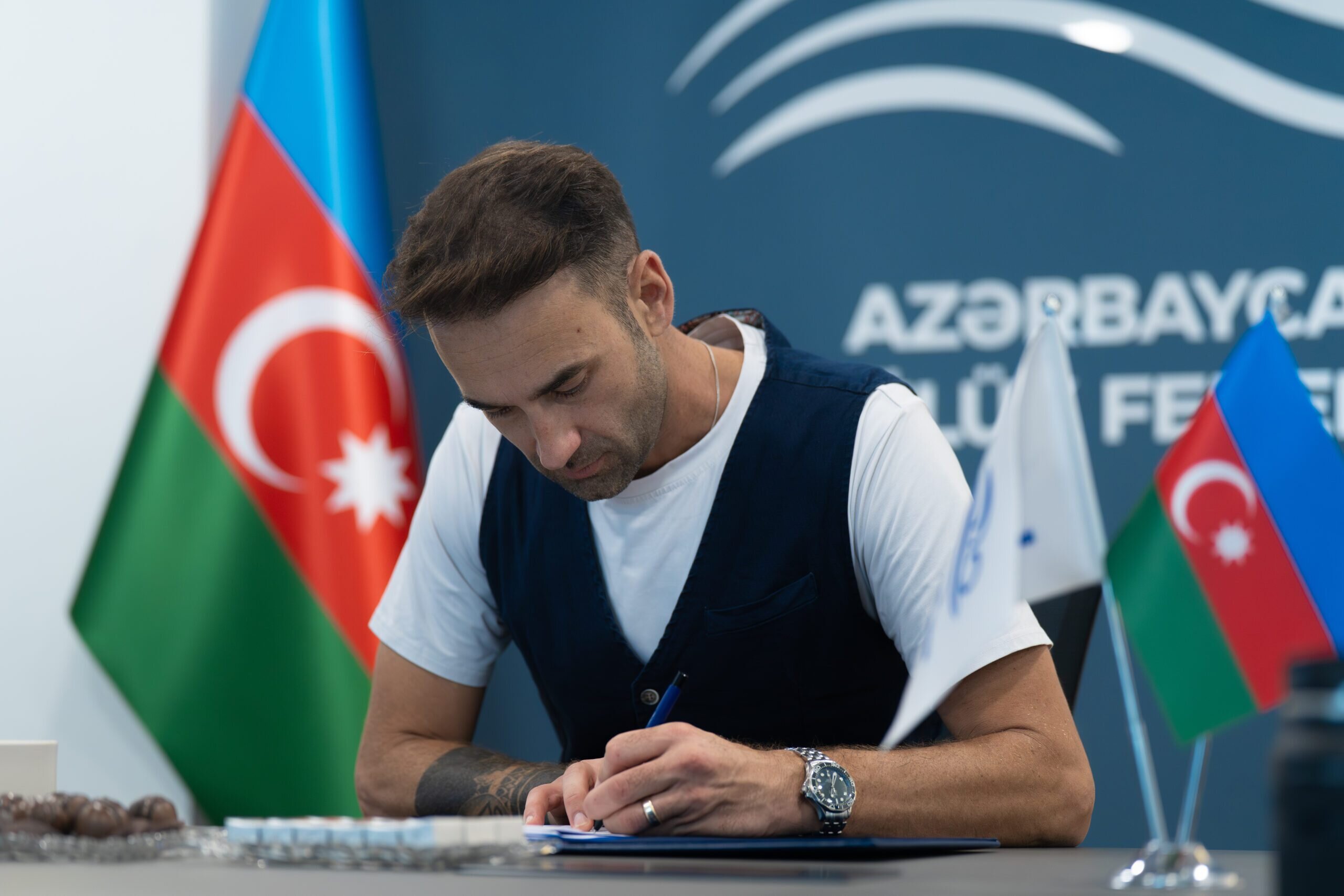 Bu gün yeni baş məşqçi milli komanda üzvlərinə Azərbaycan Üzgüçülük Federasiyasının baş katibi Oqtay Atayev tərəfindən təqdim olunub. İdmançılarla görüşdə ASF-nin müşaviri Rəşad Əbdürəhmanov, idman direktoru Pyer Ləfonten və idman meneceri Mehdi Məmmədov iştirak ediblər.