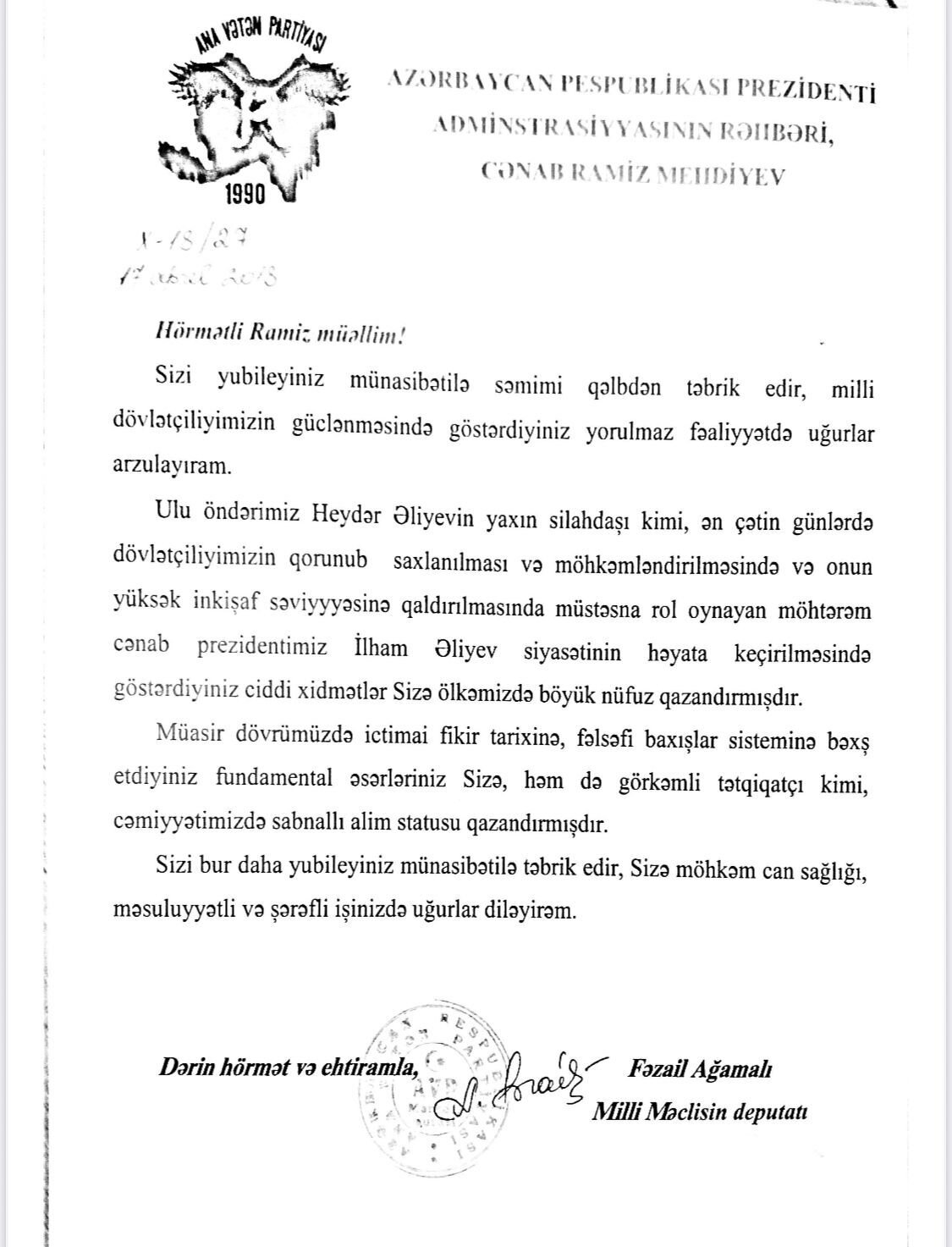 Ana Vətən Partiyasının sədri, sabiq deputat Fəzail Ağamalının Ramiz Mehdiyevə məktubu üzə çıxıb.