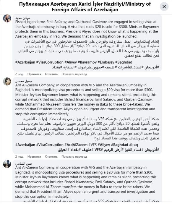 Artıq vəziyyət o həddə çatıb ki, əvvələr sosial şəbəkələrdə şikayətlənən İraq vətəndaşları, iş adamları artıq Azərbaycanın dövlət qurumlarına, xaricə səfər edən rəsmi şəxslərə səfirliyimizin fəaliyyəti, viza və pasport alveri, süründürməçilik, bu sahədə monopoliya yaradılması, rüşvət tələb edilməsi ilə bağlı şikayət edirlər. Azərbaycana sərmayə yatırmaq istəyən İraq şirkətləri də bu vəziyyətdən narazıdırlar.