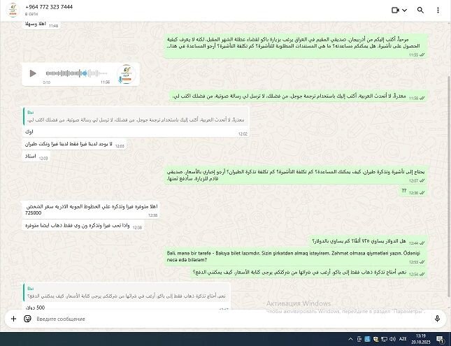 Yuxarıda qeyd olunan şikayətlərlə bağlı Azərbaycan şəfirliyi ilə şərikli biznes qurmaqda adı hallanan “Əl-Zaeem” şirkəti ilə sosial şəbəkə üzərindən əlaqə saxladıq. Yaxın dostumuzun Azərbaycana səyahət etmək istədiyini bildirdik və viza məsələsində yardım istədik. Şirkətdən heç bir problem olmadığını, 500 ABŞ dolları qarşılığında viza və təyyarə bileti təşkil edə biləcəklərini söylədilər.