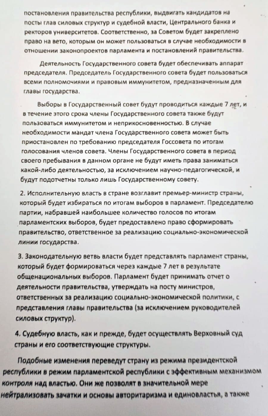 Dövlət Şurası tam hakimiyyətə və ölkədə siyasi və sosial-iqtisadi proseslərə nəzarət mexanizminə malik olacaq, həmçinin Konstitusiya Məhkəməsi və ölkənin Təhlükəsizlik Şurasının funksiyalarını yerinə yetirəcək. Dövlət Şurası parlament tərəfindən qəbul edilmiş qanun layihələrini və respublika hökumətinin qərarlarını təsdiq edəcək, güc strukturları və məhkəmə hakimiyyəti, Mərkəzi Bank və universitet rektorları vəzifələrinə namizədlər irəli sürəcək. Müvafiq olaraq, Şura lazım gəldikdə parlamentin qanun layihələrinə və hökumətin qərarlarına veto qoymaq hüququna malik olacaq.