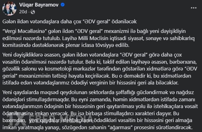 “Vergi Məcəlləsinə” gələn ildən “ƏDV geri al” mexanizmi ilə bağlı yeni dəyişikliyin edilməsi nəzərdə tutulub. Layihə Milli Məclisin iqtisadi siyasət, sənaye və sahibkarlıq komitəsində dəstəklənərək plenar iclasa tövsiyə edilib”.