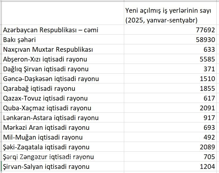 2025-ci ilin yanvar-sentyabr aylarında Azərbaycanda yeni açılan iş yerlərinin sayı 77 min 692 olub.