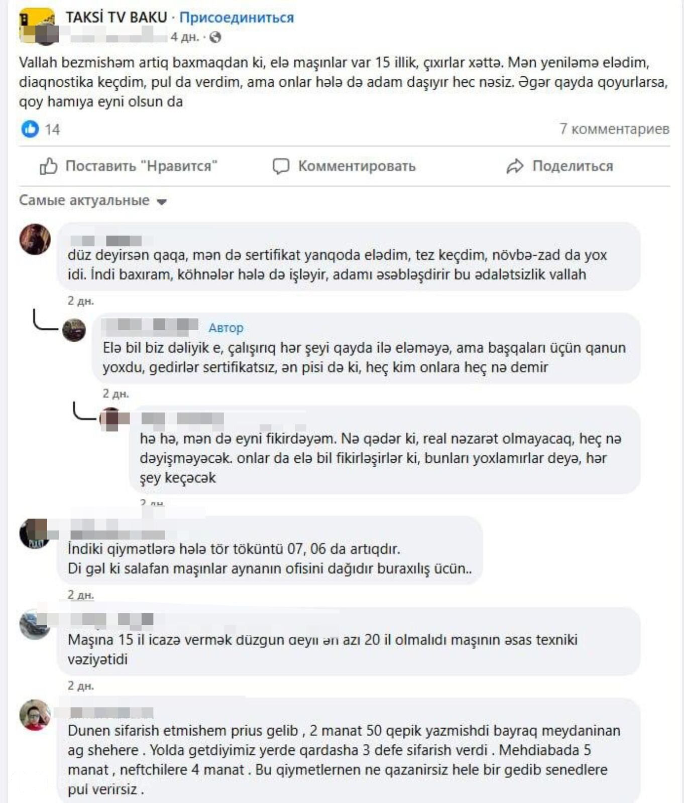 Onlar baş verənləri “ədalətsizlik” adlandırır, “ikili standartlardan” danışırlar və bu fikirlər, təəssüf ki, reallığı əks etdirir. Hamı üçün eyni olan qanunun tələblərinə cavab verməyən taksilər şəhər yollarında necə hərəkət edə bilər?