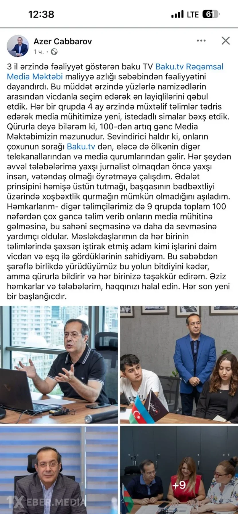 “Qürurla deyə bilərəm ki, 100-dən artıq gənc Media Məktəbimizin məzunudur. Sevindirici haldır ki, onların çoxunun sorağı Baku.TV-dən, eləcə də ölkənin digər telekanallarından və media qurumlarından gəlir. Hər şeydən əvvəl tələbələrimə yaxşı jurnalist olmaqdan öncə yaxşı insan, vətəndaş olmağı öyrətməyə çalışdım. Ədalət prinsipini həmişə üstün tutmağı, başqasının bədbəxtliyi üzərində xoşbəxtlik qurmağın mümkün olmadığını aşıladım.”-deyə, Azər Cabbarov qeyd edib.