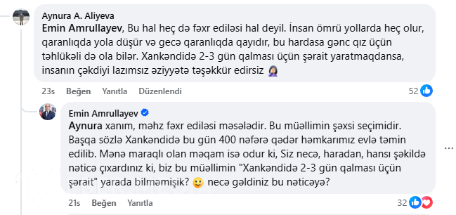 Emin Əmrullayev isə belə cavab verib: “Məhz fəxr ediləsi məsələdir. Bu, müəllimin şəxsi seçimidir. Başqa sözlə, Xankəndidə bu gün 400 nəfərə qədər həmkarımız evlə təmin edilib. Mənə maraqlı olan məqam isə odur ki, siz necə, haradan, hansı şəkildə nəticə çıxardınız ki, biz bu müəllimin Xankəndidə 2-3 gün qalması üçün şərait yarada bilməmişik? Necə gəldiniz bu nəticəyə?”