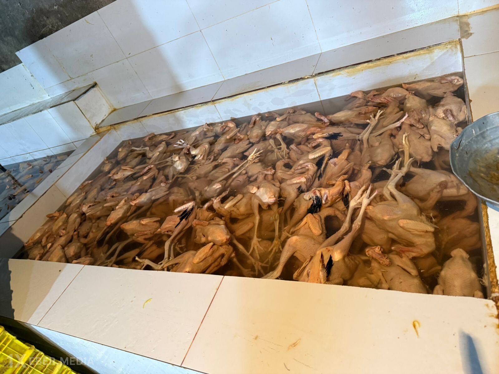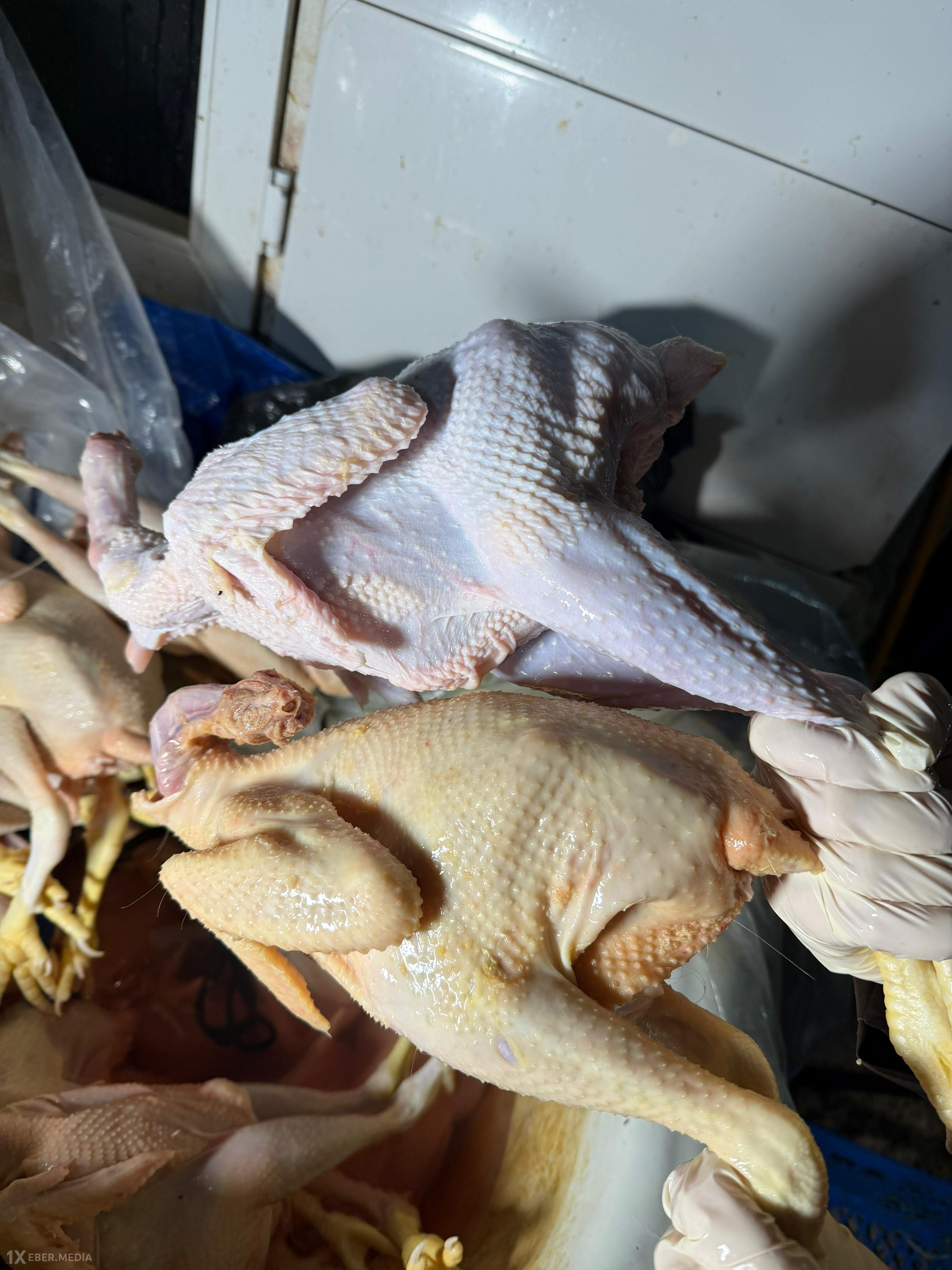Müəssisə daxilində havalandırma sistemlərinin quraşdırılmaması nəticəsində kondensasiya prosesi zamanı yaranmış suların, o cümlədən yağış sularının tavandan birbaşa qida məhsullarının üzərinə töküldüyü, kəsim prosesində sanitar-gigiyenik tələblərə riayət edilmədiyi, tüklərin təmizlənməsi, pörtlədilməsi, içalatın təmizlənməsinin eyni sahədə həyata keçirildiyi, kəsilmiş toyuqların birbaşa döşəmə üzərinə yığıldığı müəyyən edilib. Eyni zamanda “kənd toyuğu” təəssüratı yaratmaq məqsədilə mənşəyi məlum olmayan rənglərdən istifadə edilərək toyuqların rənglənməsi halları da aşkarlanıb. Sahibkar ev quşlarının bazarlarda satışa çıxarıldığını bildirib.