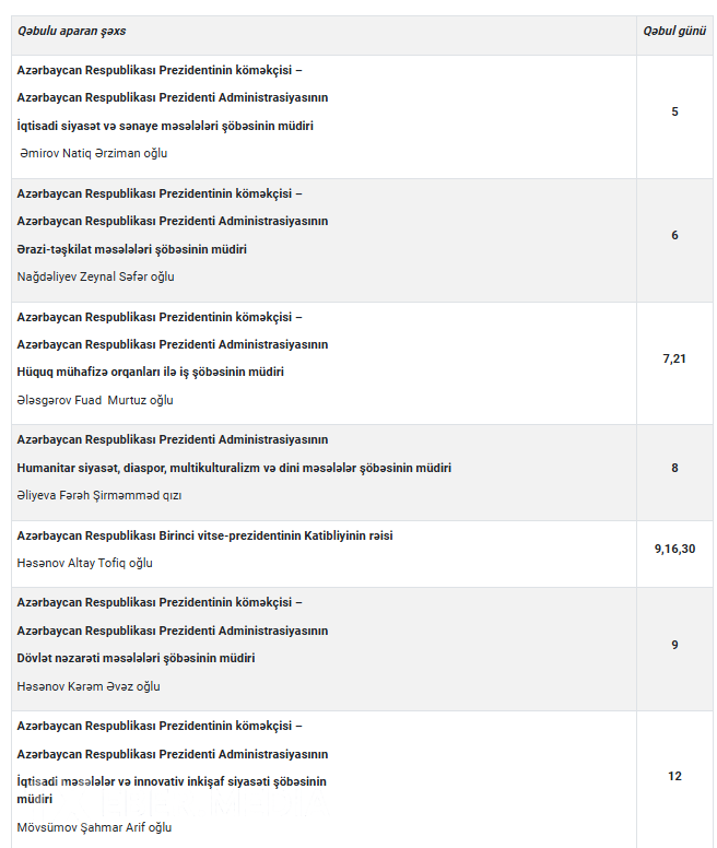 Azərbaycan Respublikası Prezident Administrasiyasının Vətəndaş Qəbulu Mərkəzində 2026-cı ilin yanvar ayında vətəndaşların qəbulu cədvəli açıqlanıb.