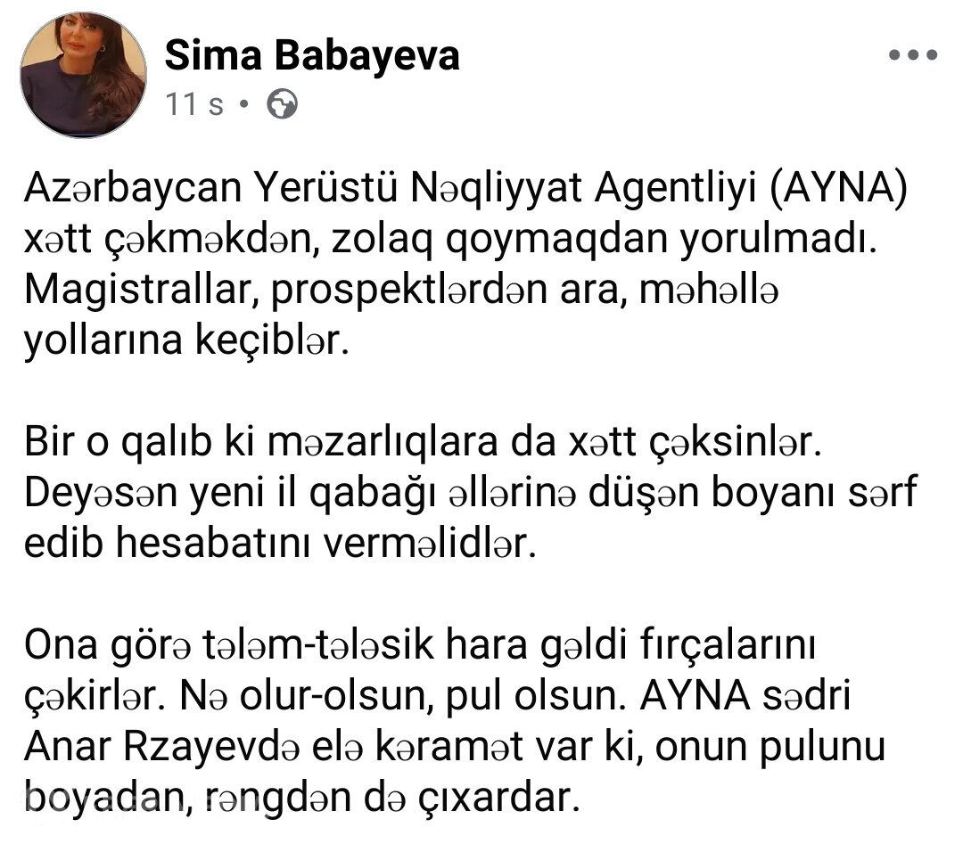 1xeber.media xəbər verir ki, bu barədə Sima Babayeva Facebook səhifəsində paylaşım edib.