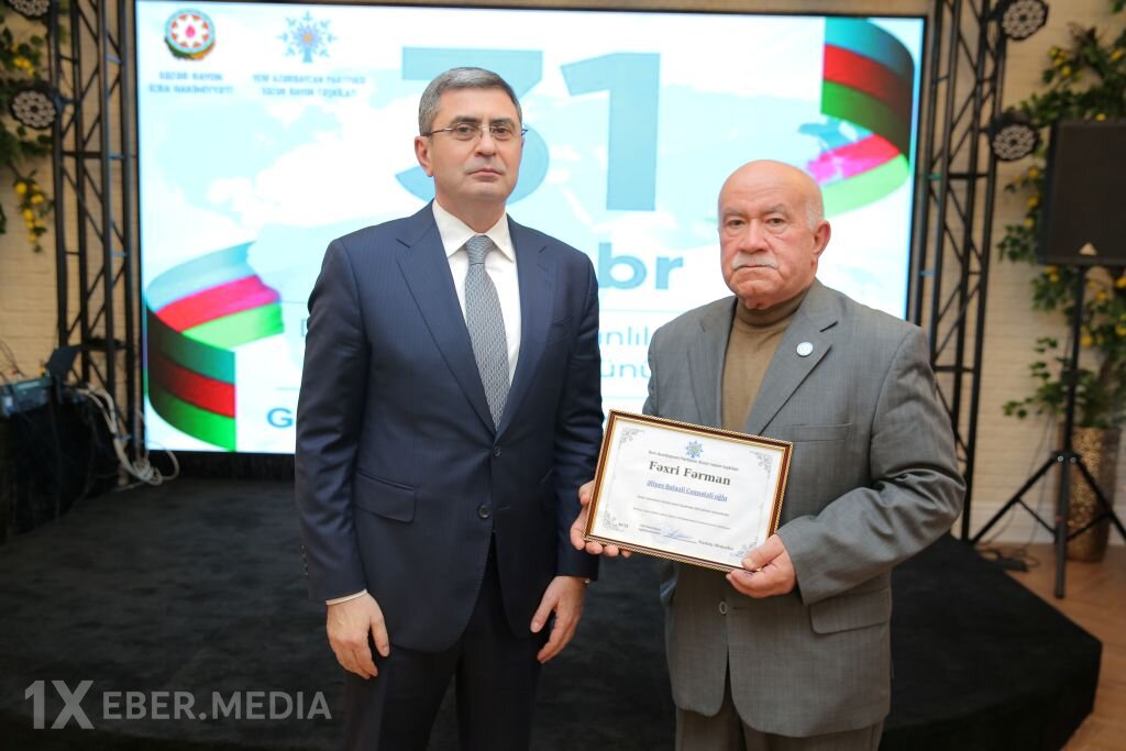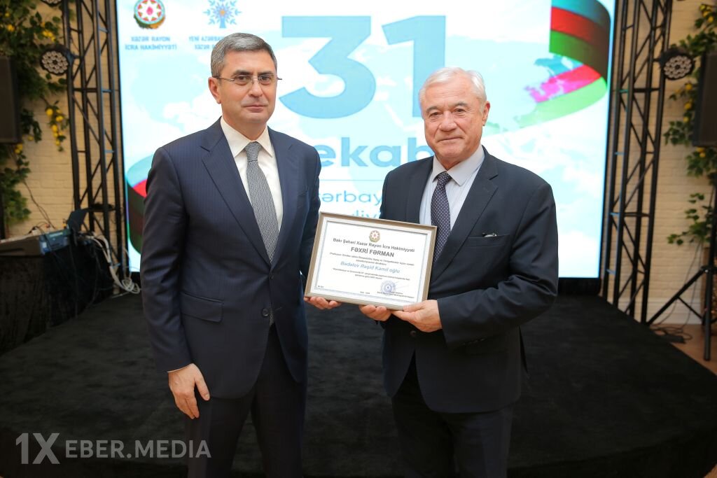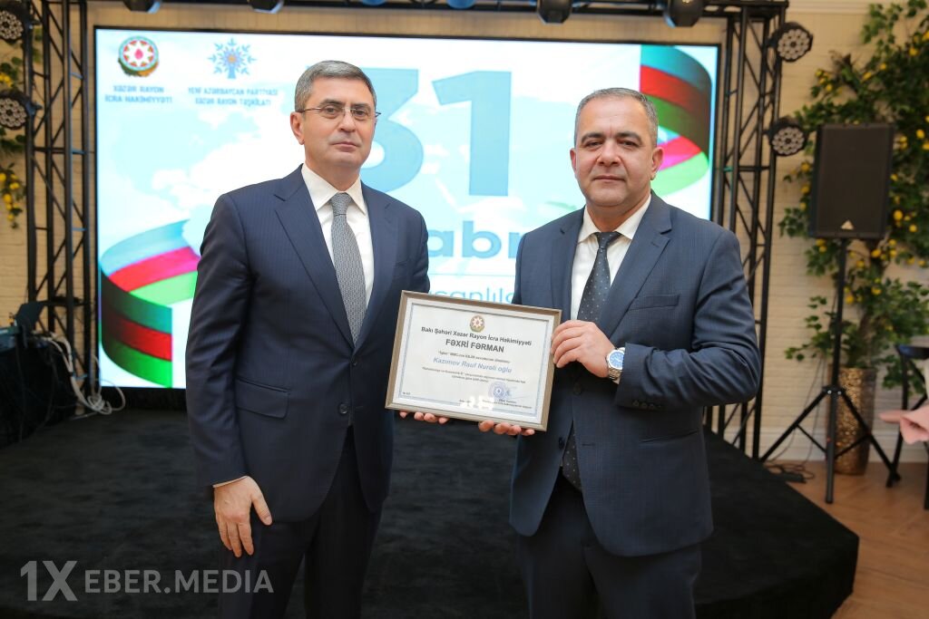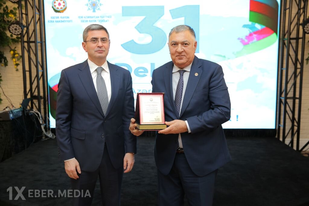 Daha sonra “Konstitusiya və Suverenlik İli” çərçivəsində rayonun ictimai həyatında fəal iştirak edən bir qrup şəxs Xəzər RİH və YAP Xəzər rayon təşkilatının Fəxri Fərman və Təşəkkürnamələri ilə təltif olunublar. Tədbir gənc muğənnilərin ifaları ilə davam etdirilib.