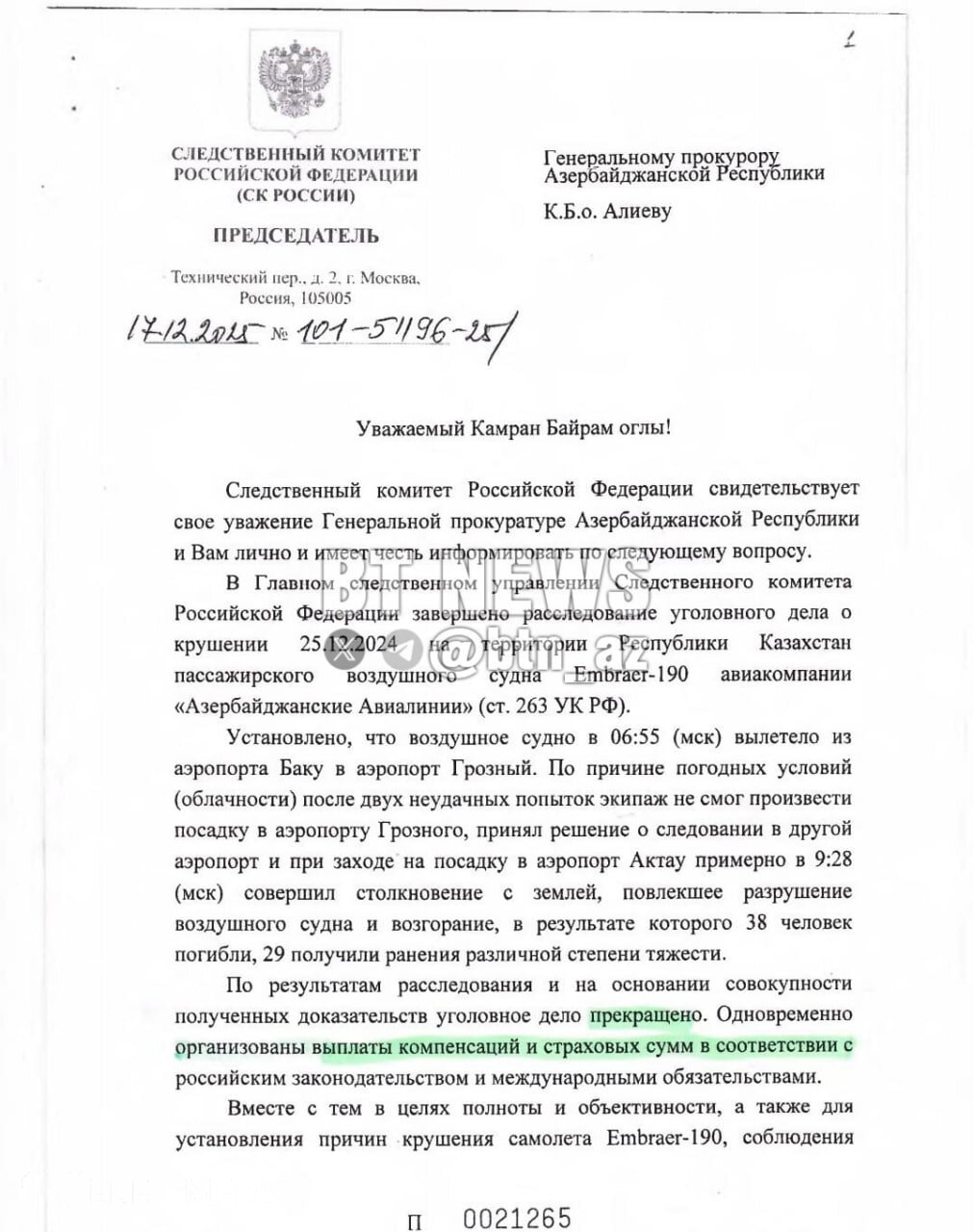 “Qafqazinfo” xəbər verir ki, AZAL-a məxsus sərnişin təyyarəsinin 2024-cü ilin dekabrında Rusiyada əlverişsiz hava şəraiti səbəbindən yerə enə bilmədiyi, daha sonra eniş zamanı yerə çırpıldığı, bu əsasda cinayət işinə xitam verildiyi bildirilən məktub ölkə ictimaiyyəti arasında ciddi rezonans doğurub.