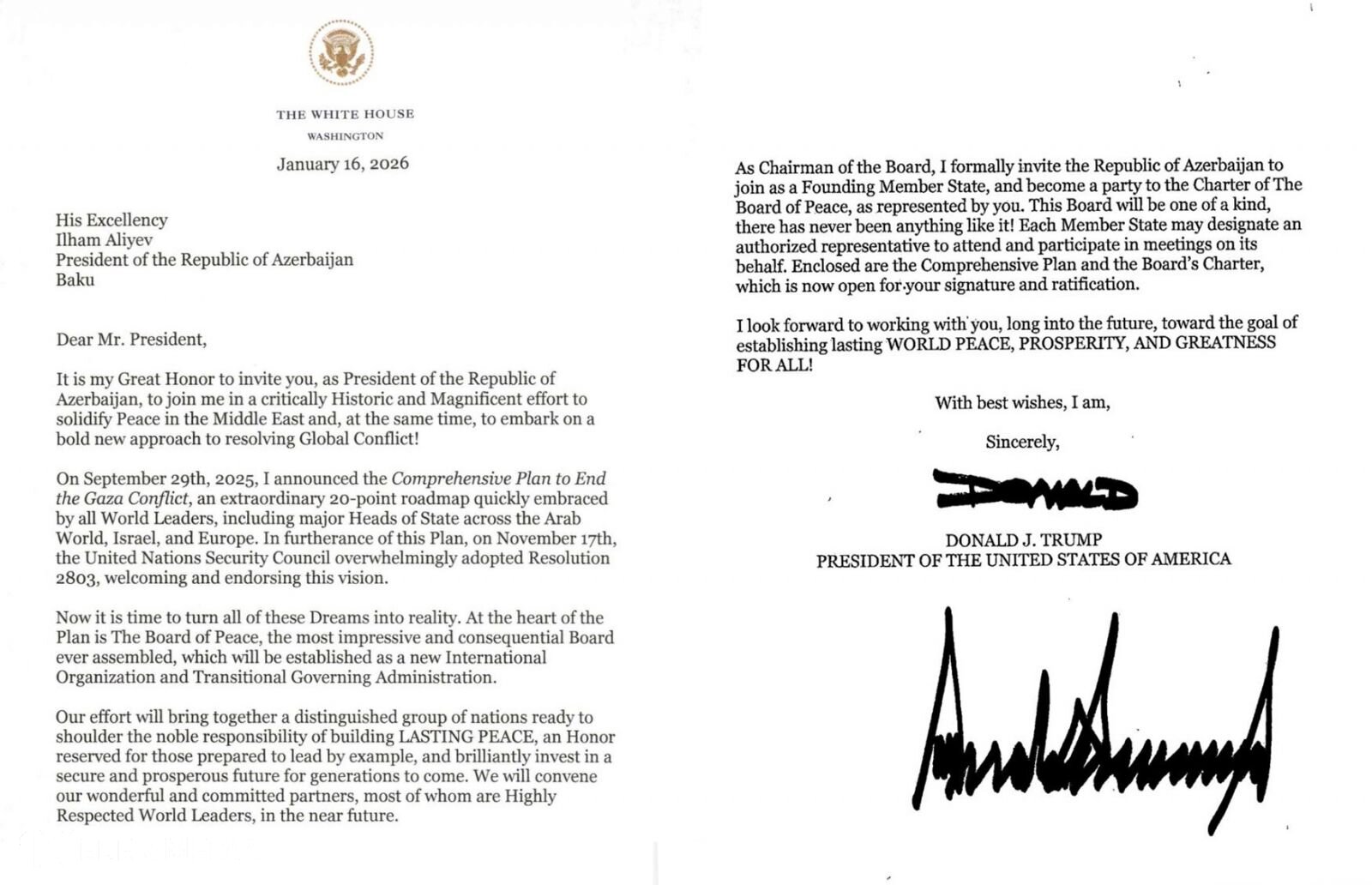 Mən 2025-ci il sentyabrın 29-da Qəzza münaqişəsinə son qoymaq üçün əhatəli plan elan etdim. Bu, Ərəb dünyası, İsrail və Avropa da daxil olmaqla, bütün dünya liderləri və əsas dövlət başçıları tərəfindən sürətlə qəbul edilən 20 bəndlik fövqəladə yol xəritəsidir. Həmin planın davamı olaraq, noyabrın 17-də Birləşmiş Millətlər Təşkilatının Təhlükəsizlik Şurası 2803 saylı qətnaməni böyük səs çoxluğu ilə qəbul edərək, bu baxışı alqışladı və dəstəklədi.