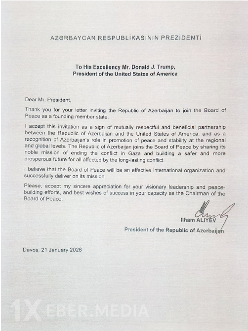 Şuranın Sədri kimi, Azərbaycan Respublikasını təsisçi üzv dövlət qismində qoşulmağa və Sizin təmsilçiliyinizlə Sülh Şurasının Nizamnaməsinə tərəf olmağa rəsmi şəkildə dəvət edirəm. Bu Şura bənzərsiz bir qurum olacaq - indiyədək buna oxşar heç bir qurum mövcud olmayıb! Hər bir üzv dövlət onun adından iclaslarda iştirak etmək və təmsil olunmaq üçün səlahiyyətli nümayəndə təyin edə bilər. Əlavədə əhatəli plan və hazırda imzalanma və ratifikasiya üçün açıq olan Şuranın Nizamnaməsi təqdim olunur.