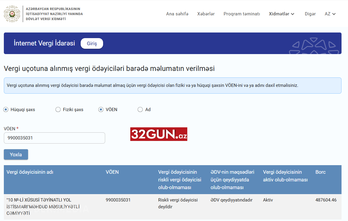 Məlum olub ki, sözügedən “10 №-li Xüsusi Təyinatlı Yol İstismarı” MMC-nin dövlətə külli miqdarda vergi borcu mövcuddur. Şirkətin vergi borcu 487.119,28 manat təşkil edir.