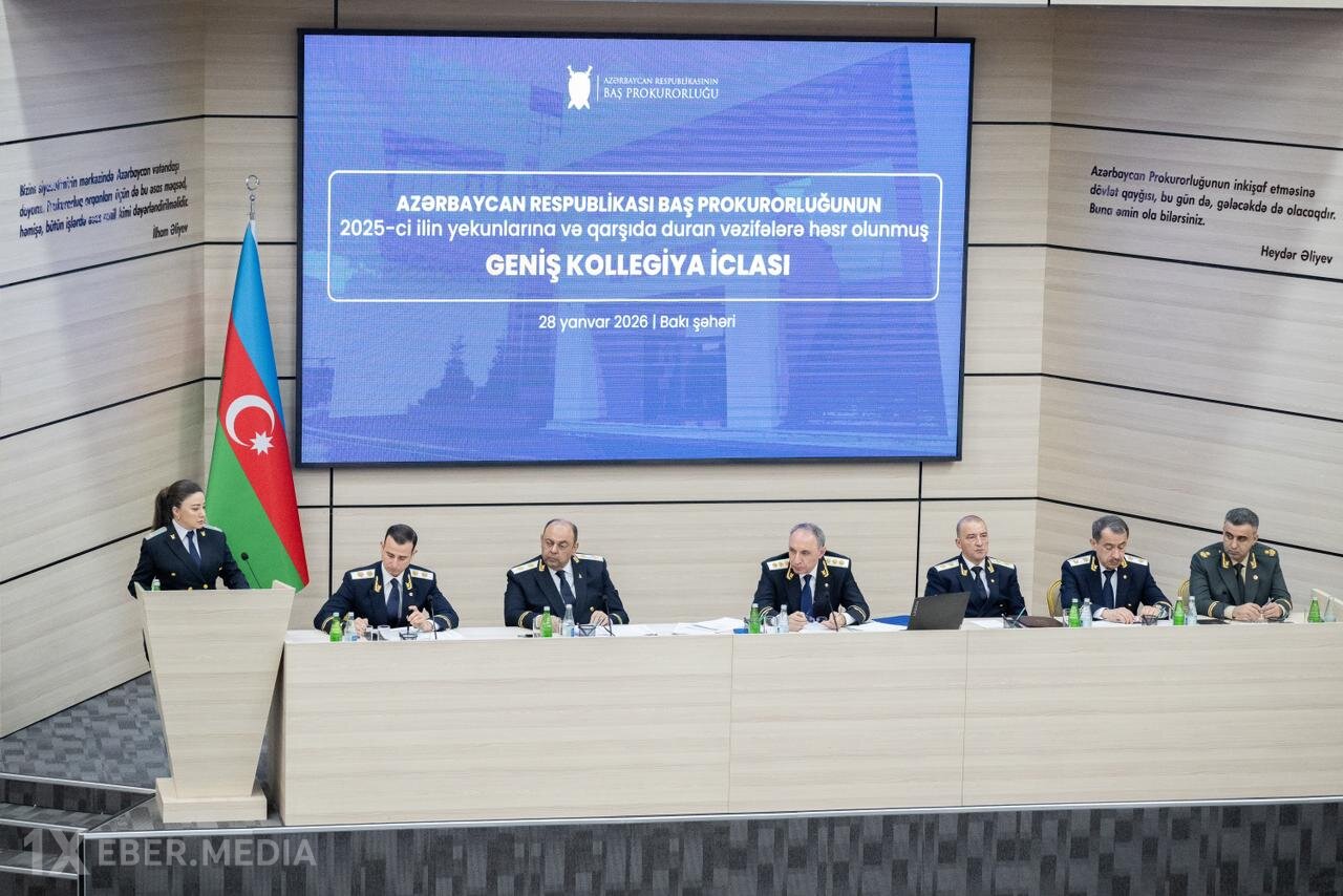 Baş prokuror Kamran Əliyevin rəhbərliyi ilə Azərbaycan Respublikasının Prokurorluq orqanları tərəfindən 2025-ci ildə qanunla prokurorluq orqanlarının səlahiyyətinə aid bütün fəaliyyət istiqamətləri üzrə görülmüş işlərin vəziyyəti və qarşıda duran vəzifələrin müzakirəsinə həsr olunmuş geniş kollegiya iclası keçirilib.