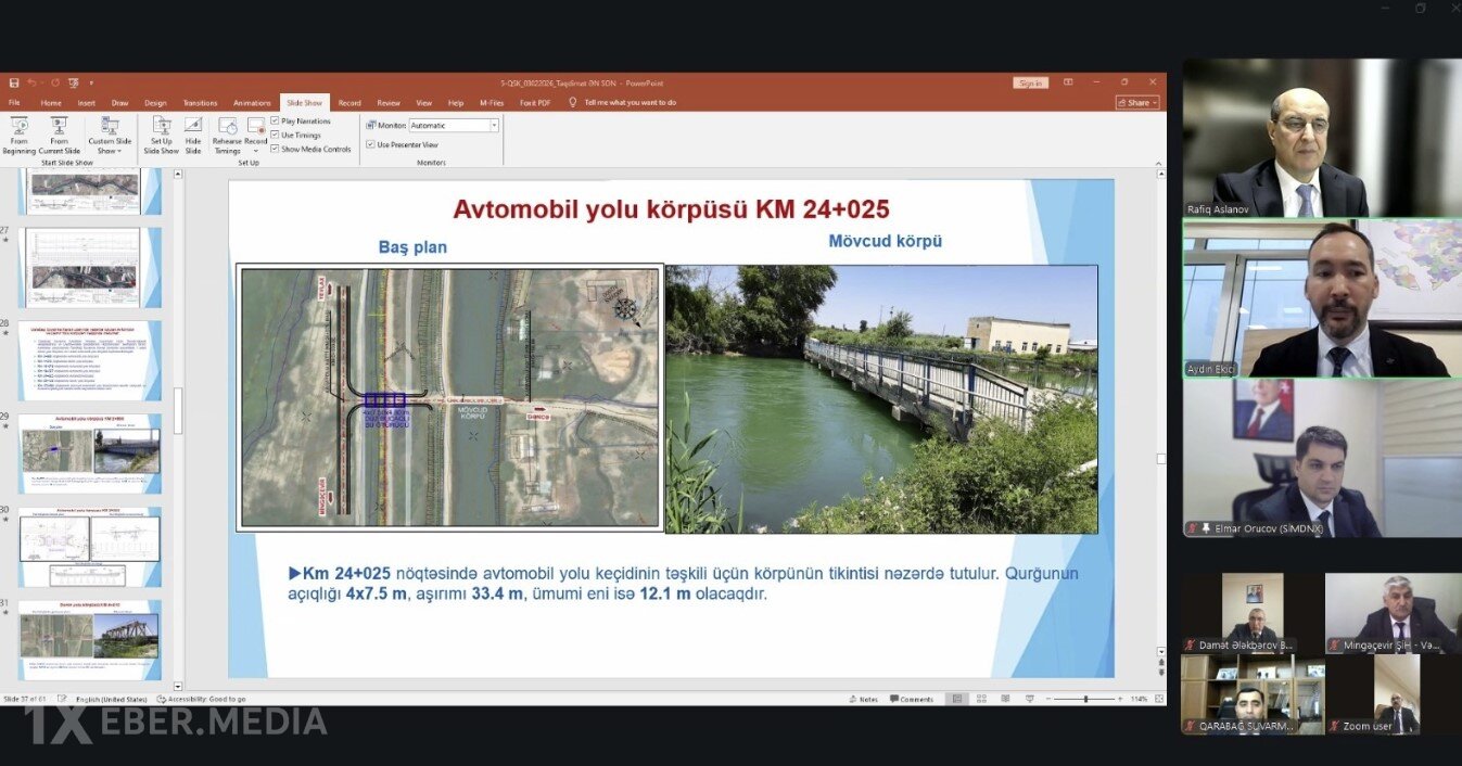 Daha sonra Dövlət Su Ehtiyatları Agentliyinin tabeliyində olan layihə institutu və layihəyə cəlb edilmiş PROYAPI və TEMELSU şirkətlərinin mütəxəssisləri tərəfindən birgə hazırlanmış layihə sənədlərinin cari vəziyyəti barədə təqdimat keçirilib. Təqdimatda Qarabağ suvarma kanalının 26 km-lik 1-ci hissəsinin layihə-smeta sənədlərinin yekunlaşmaq üzrə olduğu bildirilərək, Qarabağ, Mil və Muğan düzlərində aqrar-sənaye komplekslərinin inkişaf perspektivləri nəzərə alınmaqla layihənin mümkün variantlarının araşdırılmasının tamamlandığı vurğulanıb.