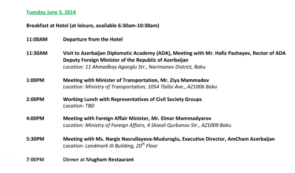 HDİ-nin rəsmi saytında yayımlanan məlumata görə, səfər “AzPod” şirkəti ilə birgə təşkil olunub. Gündəlikdə ABŞ Konqres nümayəndələrinin Bakıda bir sıra rəsmi və ictimai şəxslərlə görüşləri nəzərdə tutulub. Həmin siyahıda sabiq xarici işlər naziri Elmar Məmmədyarovla yanaşı, Milli Məclisin deputatı Jalə Əliyeva və keçmiş nəqliyyat naziri Ziya Məmmədovun da adları yer alır.