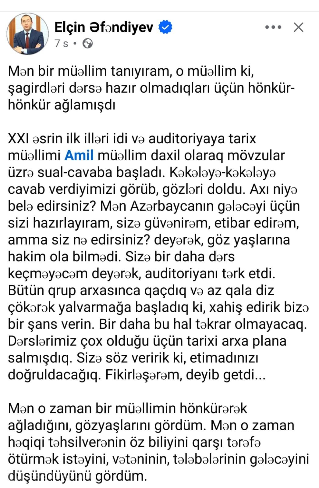 "XXI əsrin ilk illəri idi və auditoriyaya tarix müəllimi Amil müəllim daxil olaraq mövzular üzrə sual-cavaba başladı. Kəkələyə-kəkələyə cavab verdiyimizi görüb, gözləri doldu. Axı niyə belə edirsiniz? Mən Azərbaycanın gələcəyi üçün sizi hazırlayıram, sizə güvənirəm, etibar edirəm, amma siz nə edirsiniz? deyərək, göz yaşlarına hakim ola bilmədi. Sizə bir daha dərs keçməyəcəm deyərək, auditoriyanı tərk etdi. Bütün qrup arxasınca qaçdıq və az qala diz çökərək yalvarmağa başladıq ki, xahiş edirik bizə bir şans verin. Bir daha bu hal təkrar olmayacaq. Dərslərimiz çox olduğu üçün tarixi arxa plana salmışdıq. Sizə söz veririk ki, etimadınızı doğruldacağıq. Fikirləşərəm, deyib getdi...
