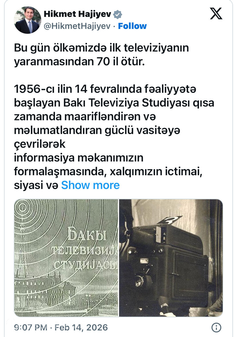 1xeber.media xəbər verir ki, bunu Azərbaycan Respublikası Prezidentinin köməkçisi - Prezident Administrasiyasının Xarici siyasət məsələləri şöbəsinin müdiri Hikmət Hacıyev "X"dəki hesabında yazıb.