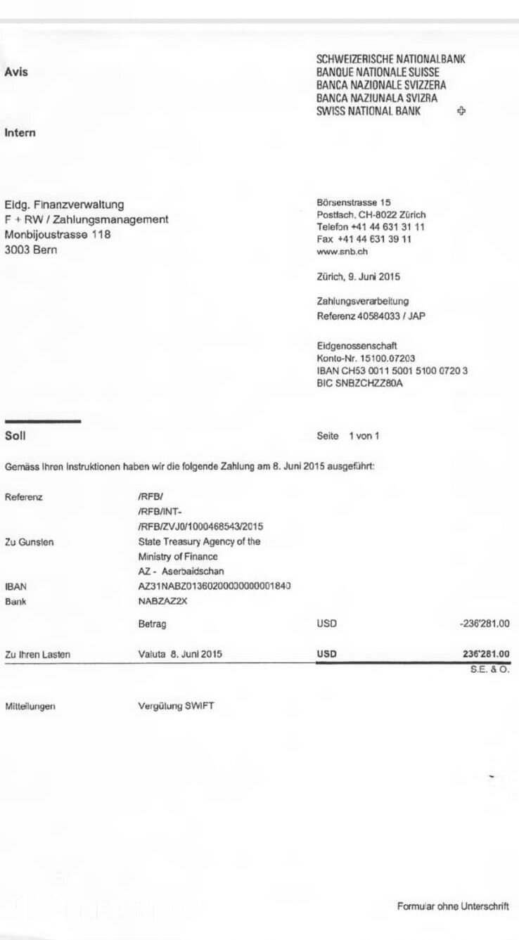 Bu məsələ ilə əlaqədar İsveçrə hökumətinin ödədiyi vəsaitin çeki də mövcuddur.