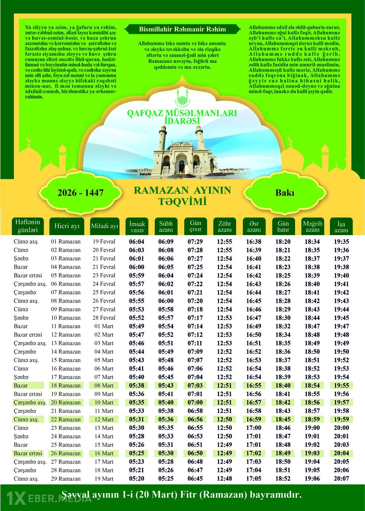 Ramazan ayının təqvimi açıqlanıb.