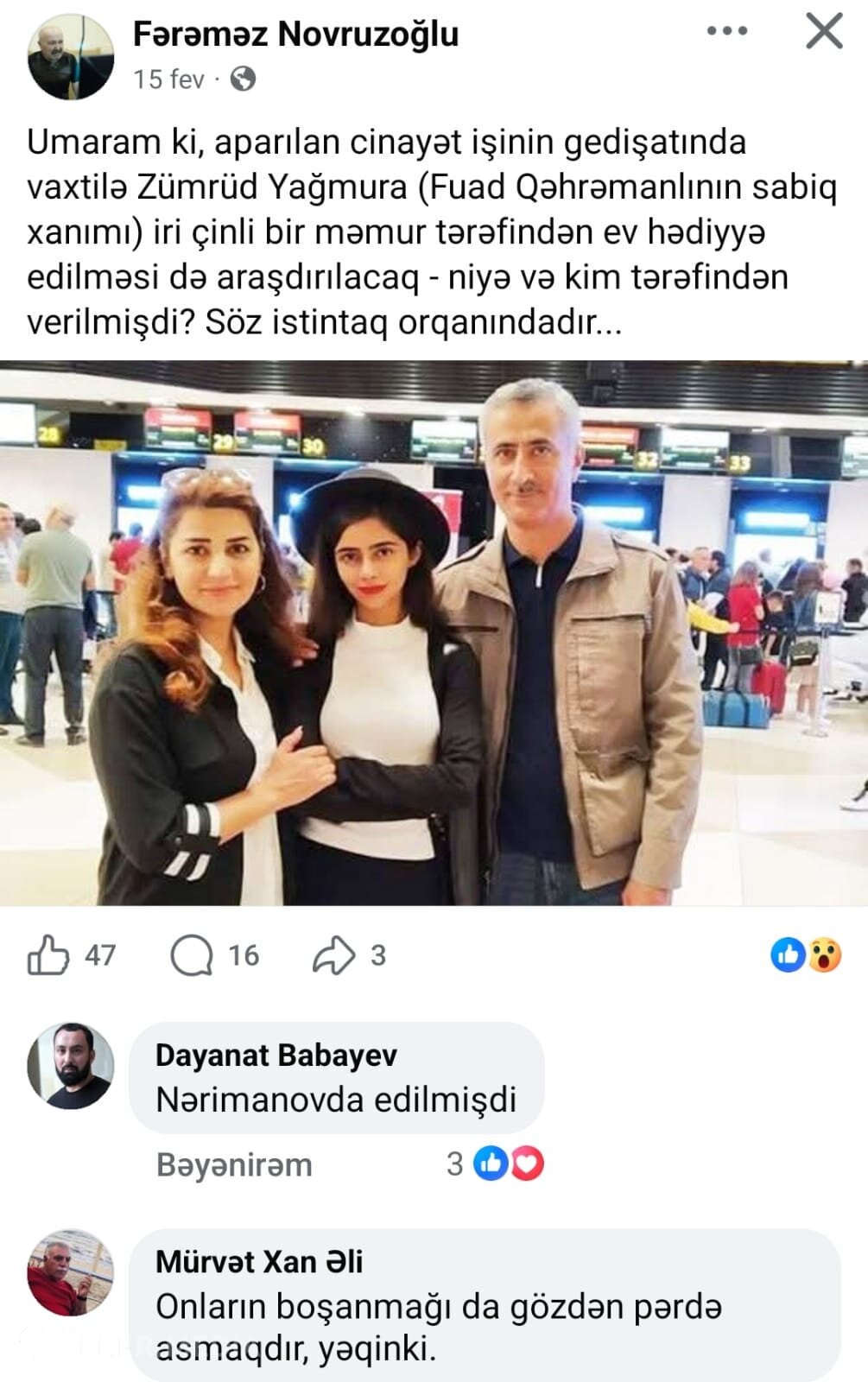 Təsəvvür edin ki, 2022-cü ildə hüquq müdafiəçisi Rüfət Səfərovgilin təşkilatı var idi, ora getmişdim. Hazırda həbsdə olan Rüfəti deyirəm. Həmin təşkilatda yer alan Zəfər Əhmədov sonra yazdı ki, biz Zümrüdün şər atdığını yaxşı bilirik, amma ondan çox qorxuruq. Sonradan həmin statusu Fuad sildirdi. Fuad və Zümrüd yalandan göstərdilər ki, guya ayrıdırlar, amma eyni yerə vurdular. Zümrüd bir daha deyim ki, Ankarada Atatürk bulvarında 245 min avroya mənzil alıb. Bilirsiniz, bu nə deməkdir? Qızlarının birinə Riqada ev alıb, o birinə Hollandiyada.