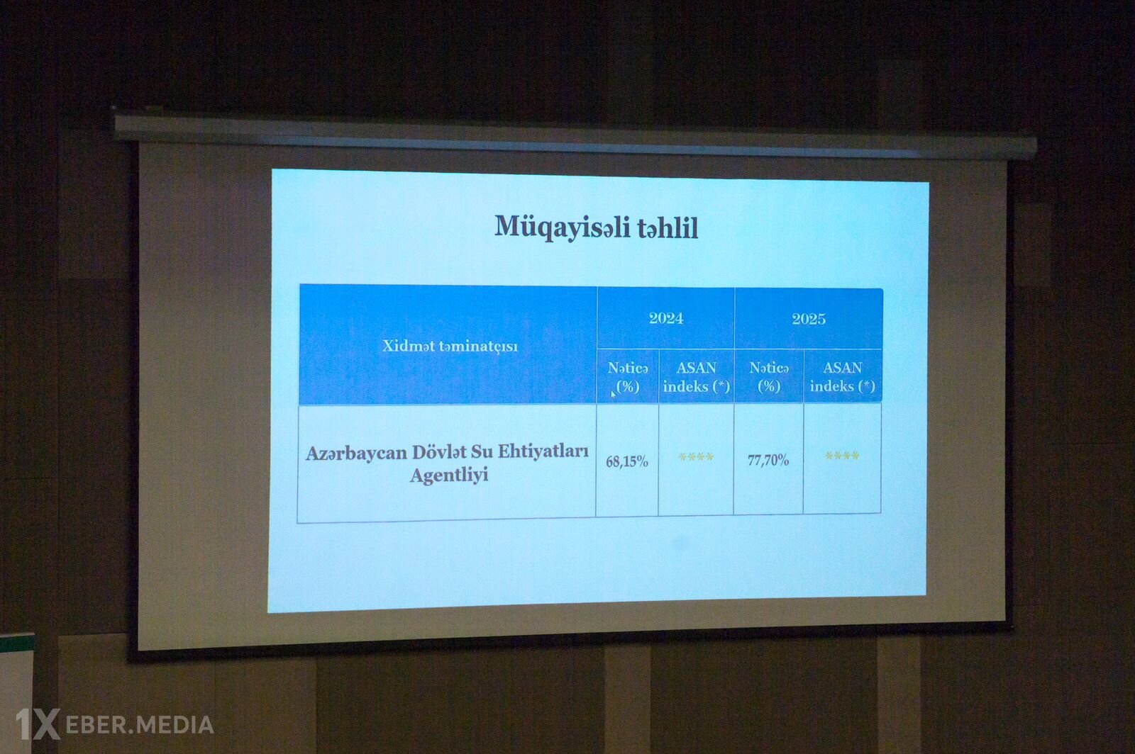 Qiymətləndirmə nəticələrinə əsasən, Azərbaycan Dövlət Su Ehtiyatları Agentliyi ASAN Xidmət indeksi üzrə 77,7% nəticə ilə 2-ci yerə, İri Şəhərlərin Birləşmiş Su Təchizatı Xidməti isə “ASAN müraciət” informasiya sistemi üzrə daxil olan müraciətlərin icra vəziyyətinə görə 53,4% nəticə ilə 2-ci yerə layiq görülüb.