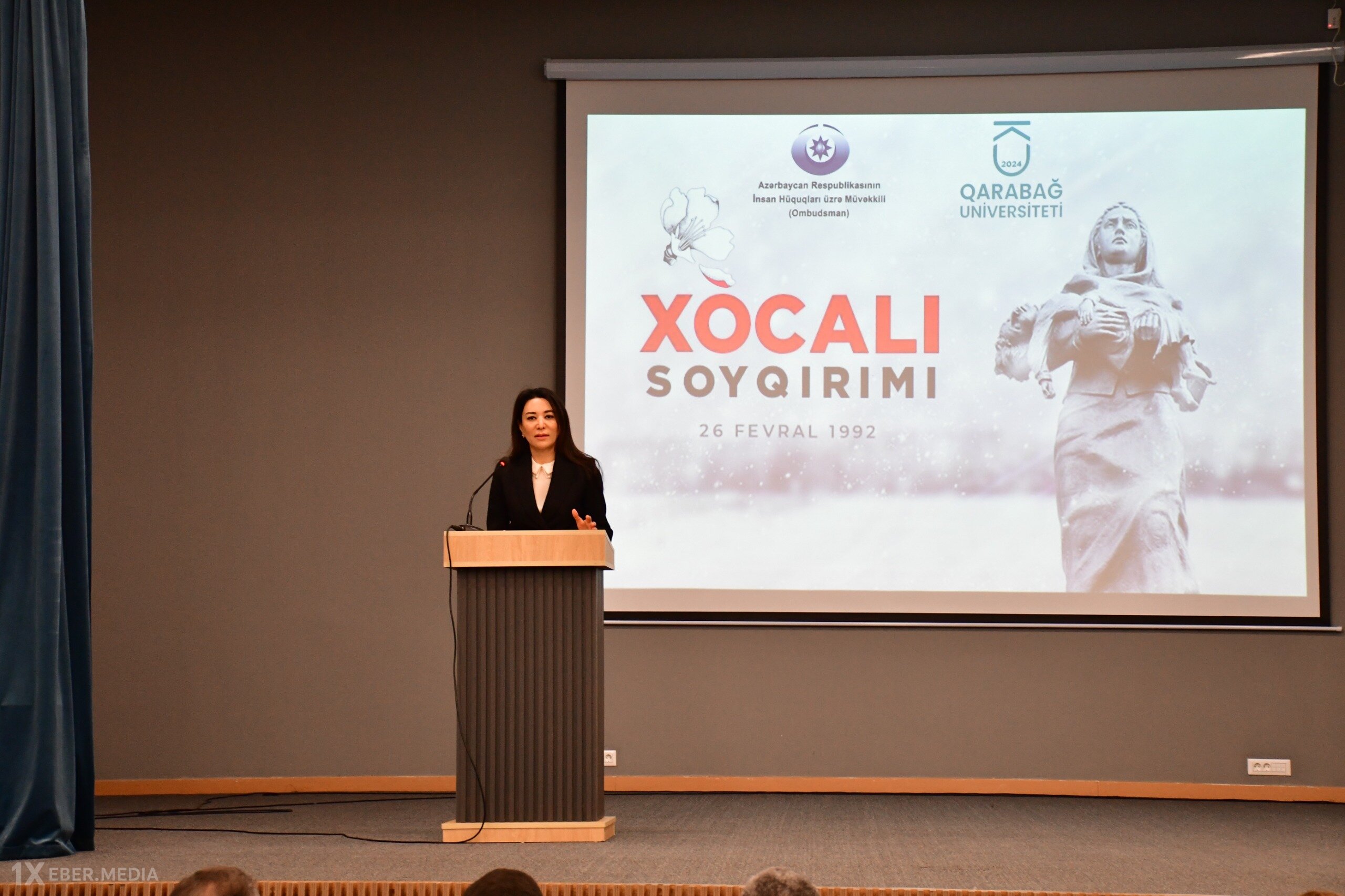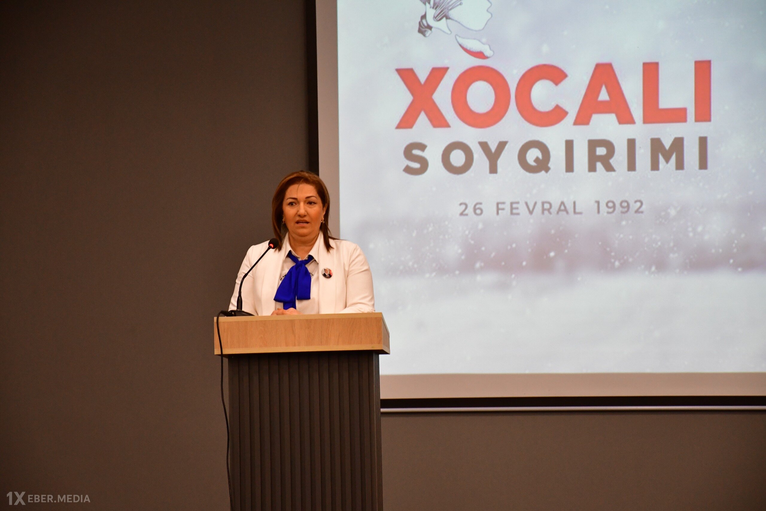 Azərbaycan Respublikasının İnsan Hüquqları üzrə Müvəkkili (Ombudsman) Səbinə Əliyeva tədbirdə açılış nitqi ilə çıxış edərək, Xocalı faciəsinin Azərbaycan xalqının tarixi yaddaşında silinməz iz buraxdığını, beynəlxalq hüquq və beynəlxalq humanitar hüququn norma və prinsiplərinin kobud şəkildə pozulması ilə nəticələnən soyqırımı cinayəti olduğunu bildirib.