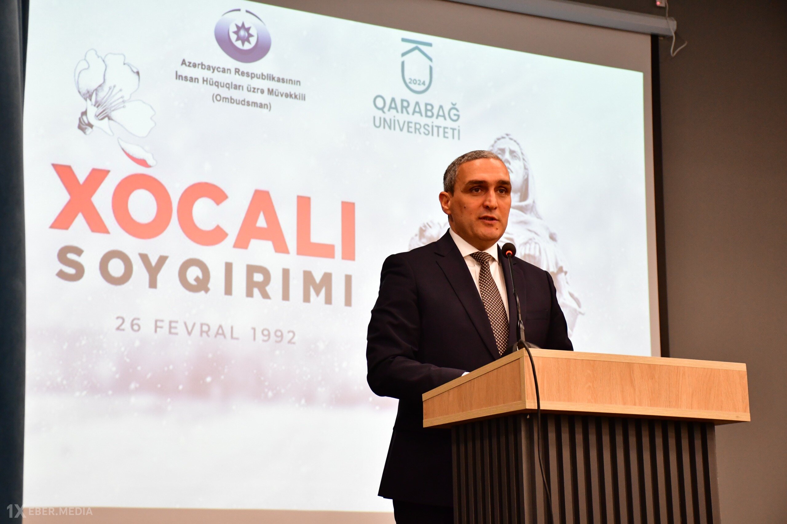 Azərbaycan Respublikasının İnsan Hüquqları üzrə Müvəkkilinin (Ombudsmanın) və Qarabağ Universitetinin birgə təşkilatçılığı ilə Xankəndi şəhərində Universitetin müəllim-tələbə heyətinin və media nümayəndələrinin iştirakı ilə Xocalı soyqırımının 34-cü ildönümünə həsr olunmuş anım tədbiri təşkil edilib.