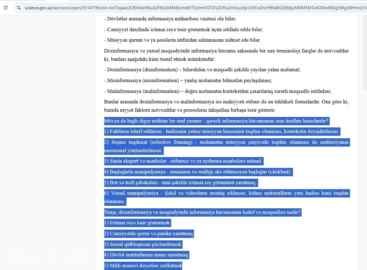 AMEA-nın Şərqşünaslıq İnstitutunun direktor müavini, fəlsəfə üzrə fəlsəfə doktoru, dosent Elnur Mustafayevin adından qurumun rəsmi saytında yayımlanan “Dezinformasiya və yaxud AMEA-ya məqsədyönlü və qərəzli informasiya hücumu haqqında bir neçə söz” sərlövhəli yazının süni intellekt vasitəsilə hazırlandığı məlum olub.