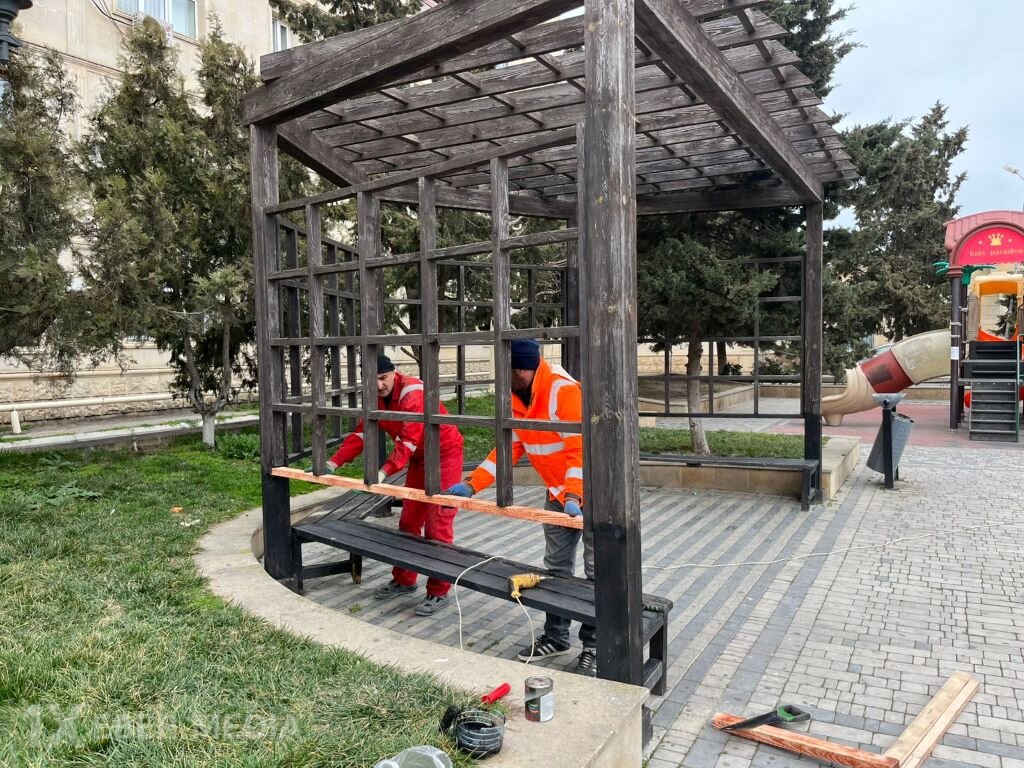 Görülən işlər çərçivəsində skamyalar təmir olunaraq rənglənib, aşınmış və yararsız daş plitələr bərpa olunub, idman qurğuları təmir edilib, yol kənarında hasarlar və giriş qapıları rənglənib, yeni ağac tingləri, dekorativ kollar və gül-çiçək əkilərək yaşıllıqlara aqrotexniki qulluq göstərilib.