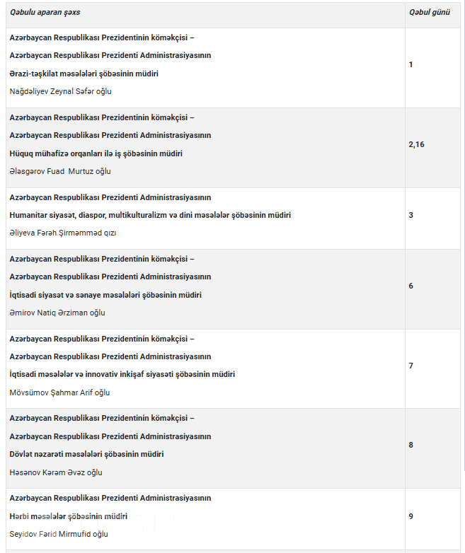 Prezident Administrasiyasının Vətəndaş Qəbulu Mərkəzində 2026-cı ilin aprel ayında vətəndaşların qəbulu cədvəli açıqlanıb.
