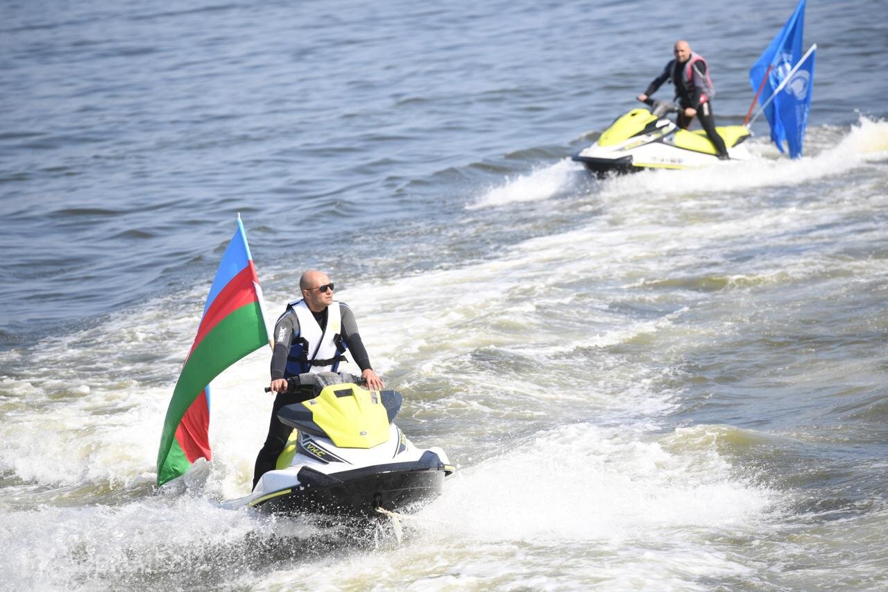 1xeber.media xəbər verir ki, Bakı bulvarında keçirilən tədbirdə əvvəlcə Azərbaycan bayraqlarını daşıyan skuterlər Xəzər dənizində dövrə vurublar.