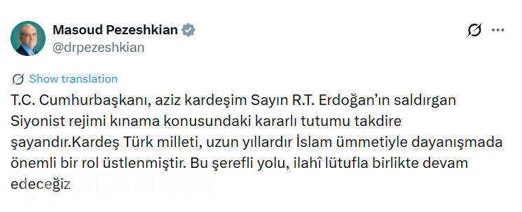 İran Prezidenti Məsud Pezeşkian regionda davam edən böhran fonunda tutduğu mövqeyə görə Türkiyə Prezidenti Rəcəb Tayyib Ərdoğana təşəkkür edib.