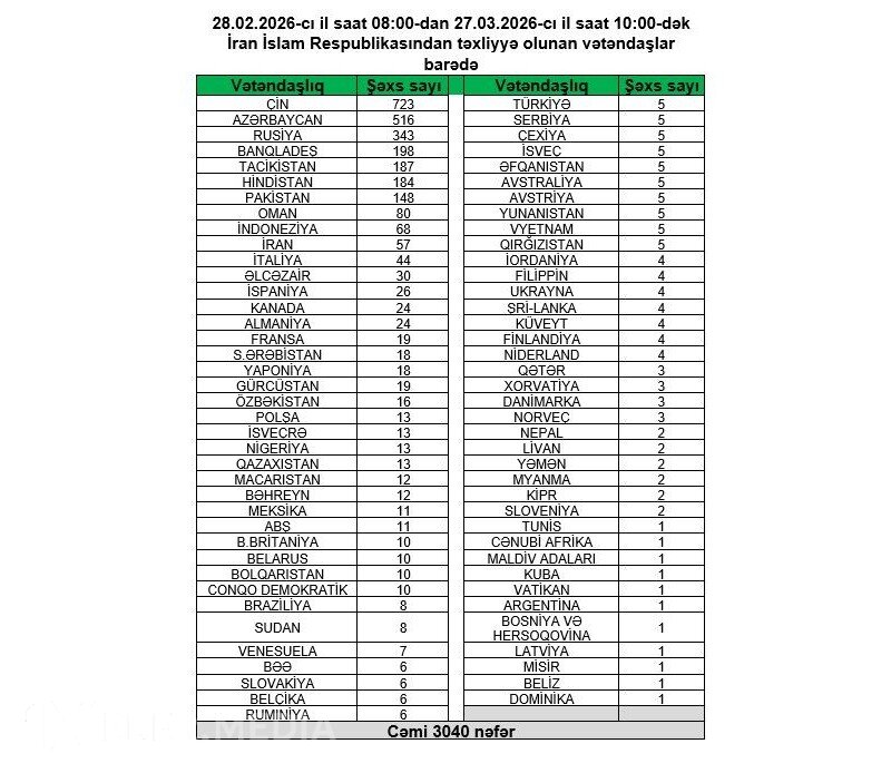 İrandan fevralın 28-i saat 8:00-dan martın 27-i saat 10:00-dək Azərbaycana ümumilikdə 3 040 nəfər təxliyə olunub.