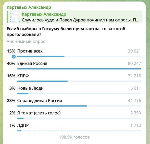 1xeber.media xəbər verir ki.müharibəyə dəstək verən blogerlərdən biri tərəfindən keçirilən sorğuda səslərin 40%-i sözügedən partiyanın payına düşüb. Pavel Durov şərhlərdə bildirib ki, sorğudakı səslərin 90%-i “ekzotik ölkələrdən” olan botlar tərəfindən süni şəkildə artırılıb.