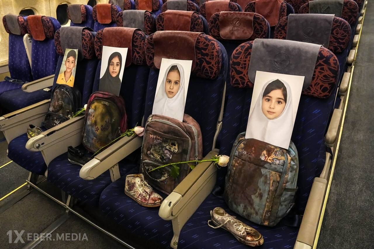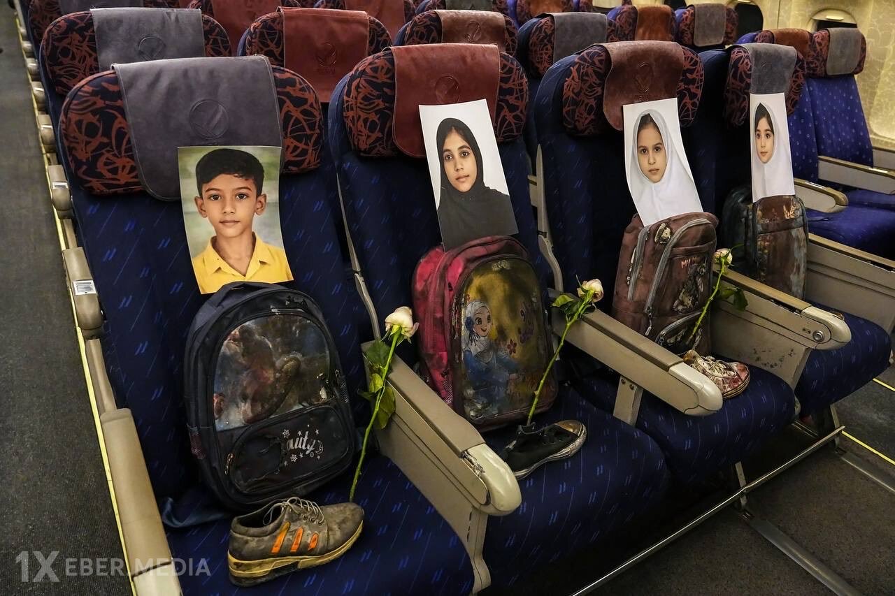 Məlumata görə, İranın cənubundakı Minab şəhərində ABŞ-İsrail zərbələri nəticəsində həlak olan ibtidai sinif şagirdlərinə aid çantalar hücum nəticəsində dağılan binanın qalıqları altından çıxarılıb və təyyarədəki bir sıra oturacaqlara yerləşdirilib.