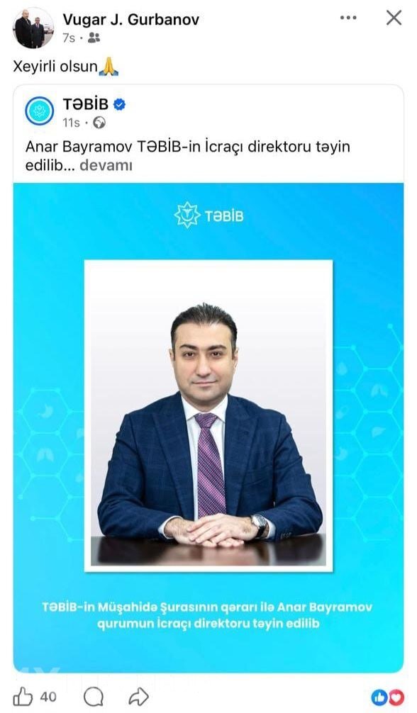 Sabiq direktor Anar Bayramovun təyinatı ilə bağlı xəbəri paylaşaraq “Xeyirli olsun” şərhini yazıb.