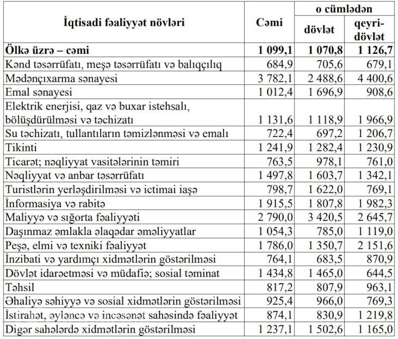 1xeber.media xəbər verir ki,Yeniavaz.com açıqlanan rəsmi məlumatlara istinadən xəbər verir ki, əməkhaqqı neft-qaz sektorunda 4006,8 manat, qeyri neft-qaz sektorunda 1046,5 manat təşkil edib. Dövlət müəssisələrində çalışan işçilərin əməkhaqları 1070,8 manat, özəl müəssisələrdə isə 1 126,7 manat olub.