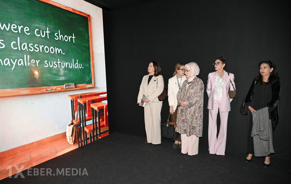 Daha sonra tədbir iştirakçıları Fələstində münaqişə nəticəsində təhsil sisteminin məhv edilməsinə həsr olunan sərgiyə baxıblar.