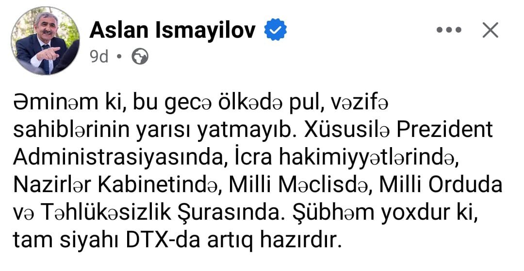 Əminəm ki, bu gecə ölkədə pul, vəzifə sahiblərinin yarısı yatmayıb. Xüsusilə Prezident Administrasiyasında, İcra hakimiyyətlərində, Nazirlər Kabinetində, Milli Məclisdə, Milli Orduda və Təhlükəsizlik Şurasında. Şübhəm yoxdur ki, tam siyahı DTX-da artıq hazırdır.