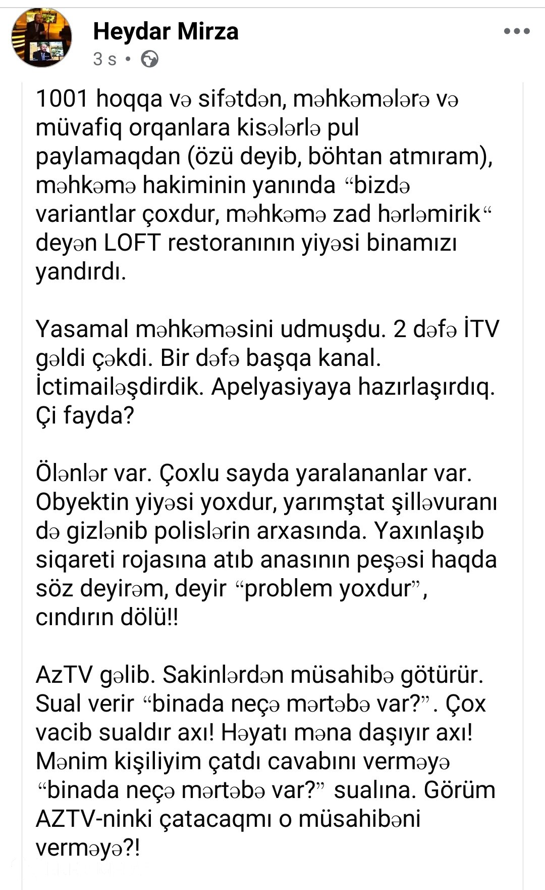 "1001 hoqqa və sifətdən, məhkəmələrə və müvafiq orqanlara kisələrlə pul paylamaqdan (özü deyib, böhtan atmıram), məhkəmə hakiminin yanında “bizdə variantlar çoxdur, məhkəmə zad hərləmirik“ deyən LOFT restoranının yiyəsi binamızı yandırdı.