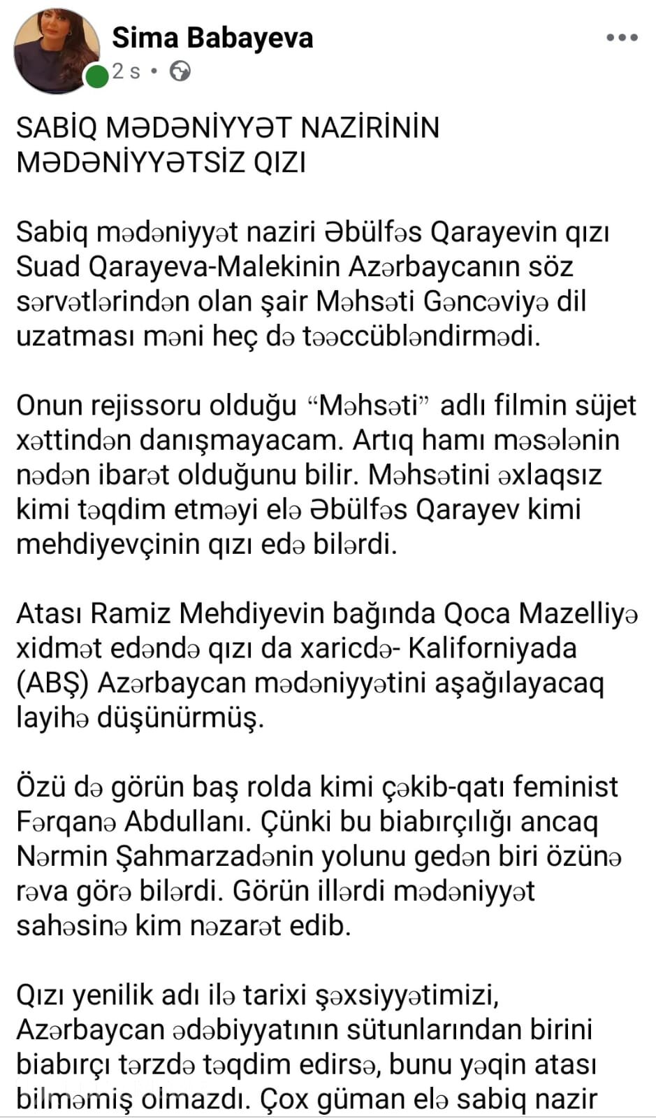 Sabiq mədəniyyət naziri Əbülfəs Qarayevin qızı Suad Qarayeva-Malekinin Azərbaycanın söz sərvətlərindən olan şair Məhsəti Gəncəviyə dil uzatması məni heç də təəccübləndirmədi.