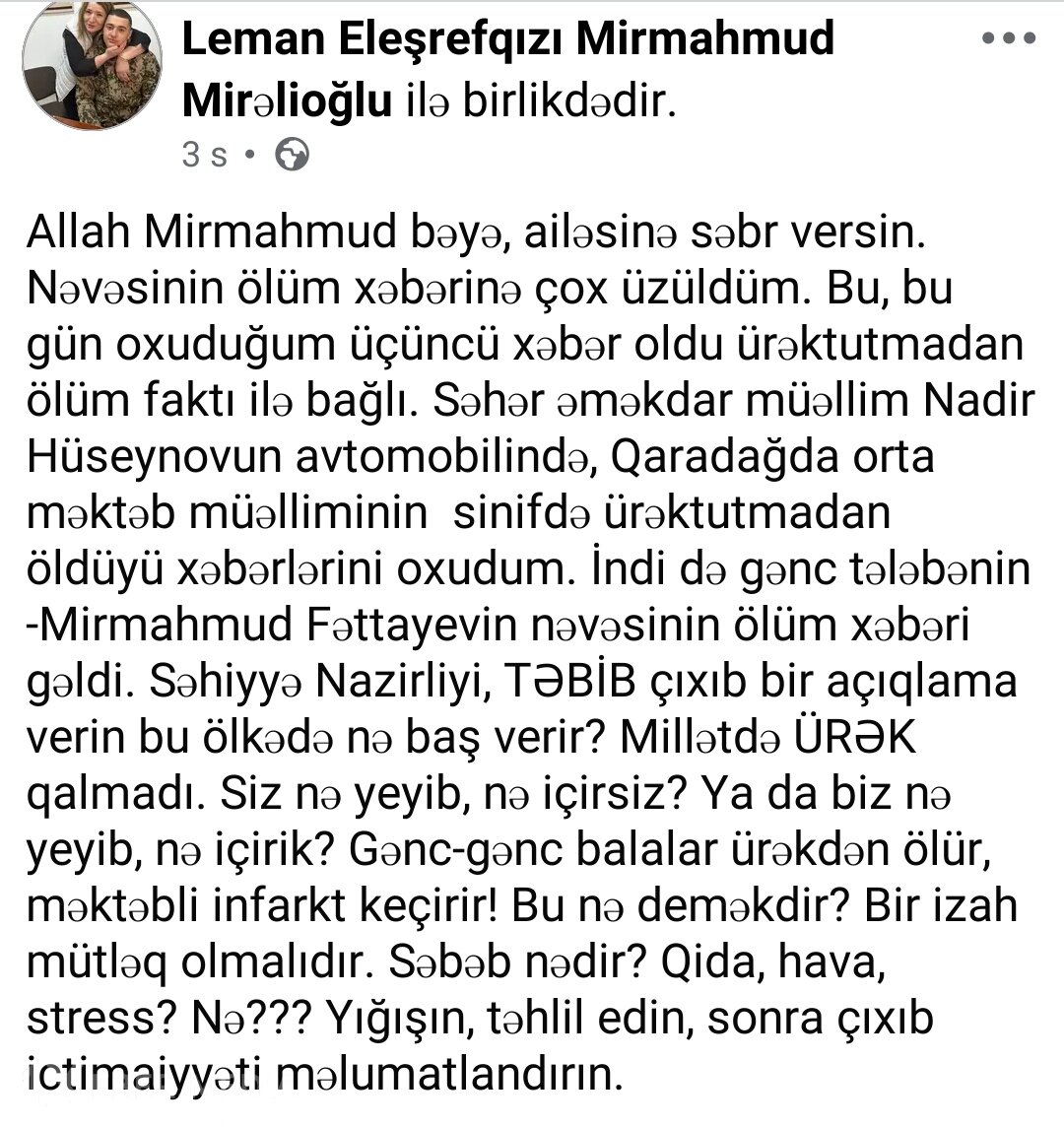 Jurnalist daha sonra bildirib ki,"Səhər əməkdar müəllim Nadir Hüseynovun avtomobilində, Qaradağda orta məktəb müəlliminin sinifdə ürəktutmadan öldüyü xəbərlərini oxudum. İndi də gənc tələbənin-Mirmahmud Fəttayevin nəvəsinin ölüm xəbəri gəldi. Səhiyyə Nazirliyi, TƏBİB çıxıb bir açıqlama verin bu ölkədə nə baş verir? Millətdə ÜRƏK qalmadı. Siz nə yeyib, nə içirsiz? Ya da biz nə yeyib, nə içirik? Gənc-gənc balalar ürəkdən ölür, məktəbli infarkt keçirir! Bu nə deməkdir? Bir izah mütləq olmalıdır. Səbəb nədir? Qida, hava, stress? Nə??? Yığışın, təhlil edin, sonra çıxıb ictimaiyyəti məlumatlandırın."